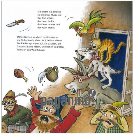 Esel, Hund, Katze und Hahn lassen sich nicht unterkriegen. Sie sind zwar nicht mehr die Jüngsten, aber auf ihre alten Tage wollen sie es noch einmal wagen und ziehen nach Bremen, um dort Stadtmusikanten zu werden. Doch auf dem Weg dorthin kommen sie an einem Haus vorbei, worin finstere Gesellen aus voller Kehle ein schauriges Räuberlied singen. Da beschließen die vier Musikanten, das Räuberpack zu vertreiben. Womit? Na, mit herrlich lauter Musik selbstverständlich!