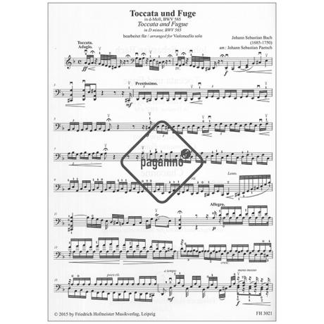 Die »Toccata und Fuge in d-Moll, BWV 565«, eines der meistgespielten Johann Sebastian Bach-Stücke für Orgel, eignet sich sehr gut für eine anspruchsvolle Bearbeitung für Cello: viele Elemente des Stückes, wie gebrochene Akkorde und Arpeggien, einstimmige Passagen und eine nur sehr zaghafte Aussetzung des Kontrapunktes sprechen für eine Bearbeitung. Die Toccata und Fuge sind Paradebeispiele für das tonale und technische Potential des Cellos. Das Stück hat eine starke dynamische Brillanz und verlangt von den SpielerInnen eine spezielle Fingerfertigkeit.