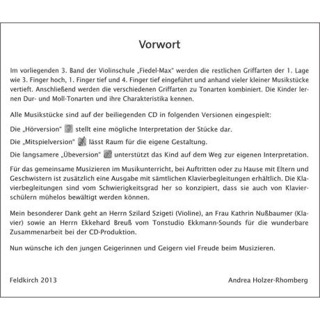 In diesem Band der Violinschule werden die restlichen Griffarten der 1. Lage (3. Finger hoch, 1. Finger tief und 4. Finger tief) eingeführt und zu Tonarten kombiniert. Die Kinder lernen Dur- und Moll-Tonarten (bis 3# und 3b) und deren Charakteristika kennen.