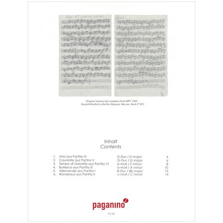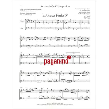Dieser Band enthält sechs zweiteilige Stücke, die aus J. S. Bachs Sechs Partiten (BWV 825–830) für Tasteninstrumente ausgewählt und für Violine und Viola transkribiert wurden.