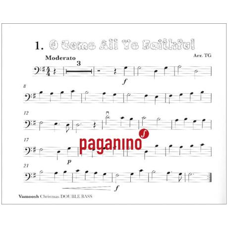 Vamoosh Christmas for young Double Bass players. 12 well known Christmas items arranged for Bass duo with optional accompanying backing-track or piano. Books are compatible with Vamoosh Christmas for Violin, Viola, Cello so you can join friends for a Christmas feast of music making. Backing-tracks are available on many online platforms such as Spotify, iTunes, GooglePlay and YouTube. Search for Vamoosh Christmas Backing-tracks.