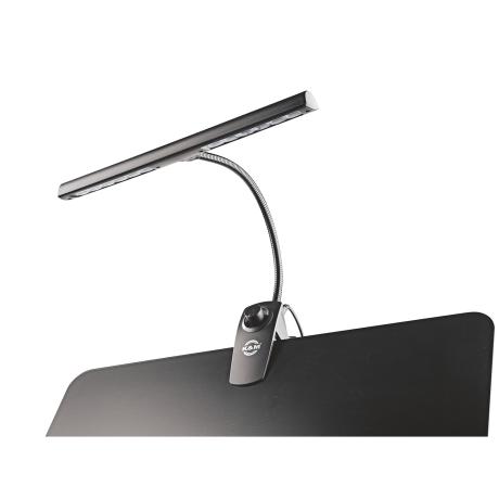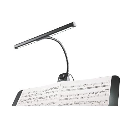 Perfektes Licht für jede Situation aus dem Hause König & Meyer. Ausgestattet mit 12 energiesparenden und langlebigen LEDs, garantiert die Notenpultleuchte jederzeit optimale Lichtverhältnisse. Die überarbeitete Leuchte kann jetzt mit Batterie oder Strom betrieben werden. Die Helligkeit ist über einen komfortablen Drehknopf dimmbar. Der flexible Schwanenhals ermöglicht die ideale Positionierung des Leuchtkegels. Ein handlicher Clip ermöglicht die komfortable Montage an Platten bis zu einer Stärke von 25 mm. Inklusive Netzteil mit 3 m Kabel und 3 x Batterie AA.
