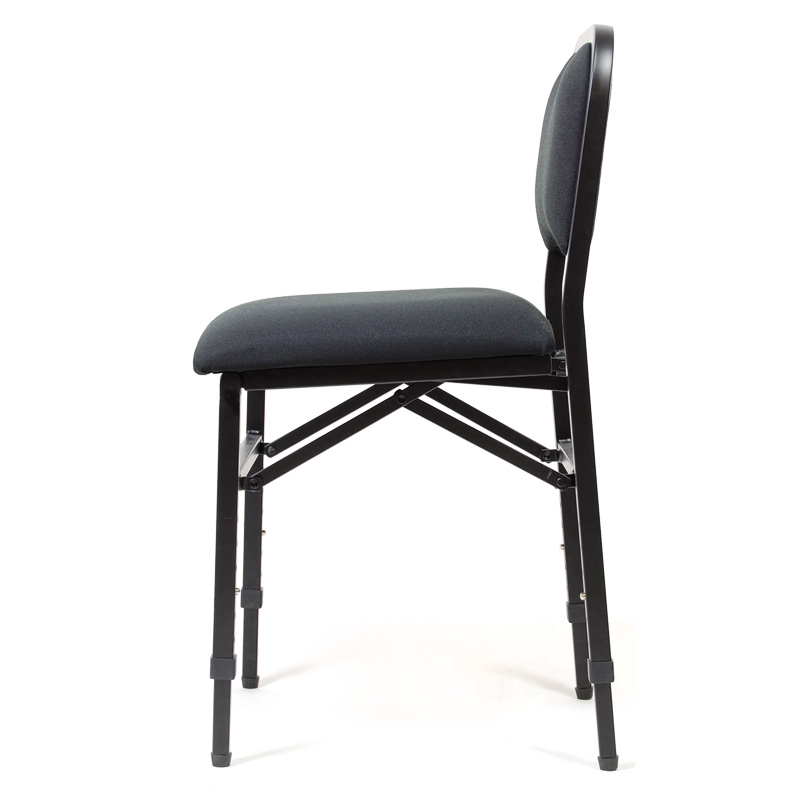 Die leicht nach vorne geneigte, fest gepolsterte Sitzfläche unterstützt eine ergonomische Spielhaltung. Für festen Stand auf jedem Boden sorgen einzeln justierbare Stuhlbeine. Zum Transport lässt sich der nur ca. 6 kg schwere Stuhl mit einem Handgriff auf kofferraumfreundliche 15 cm Höhe zusammenfalten.