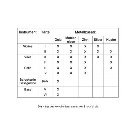 Härtegrad IV ist ein weiches Kolophonium für Violoncello im Vergleich zu dem härteren Zinn III Metall-Kolophonium.